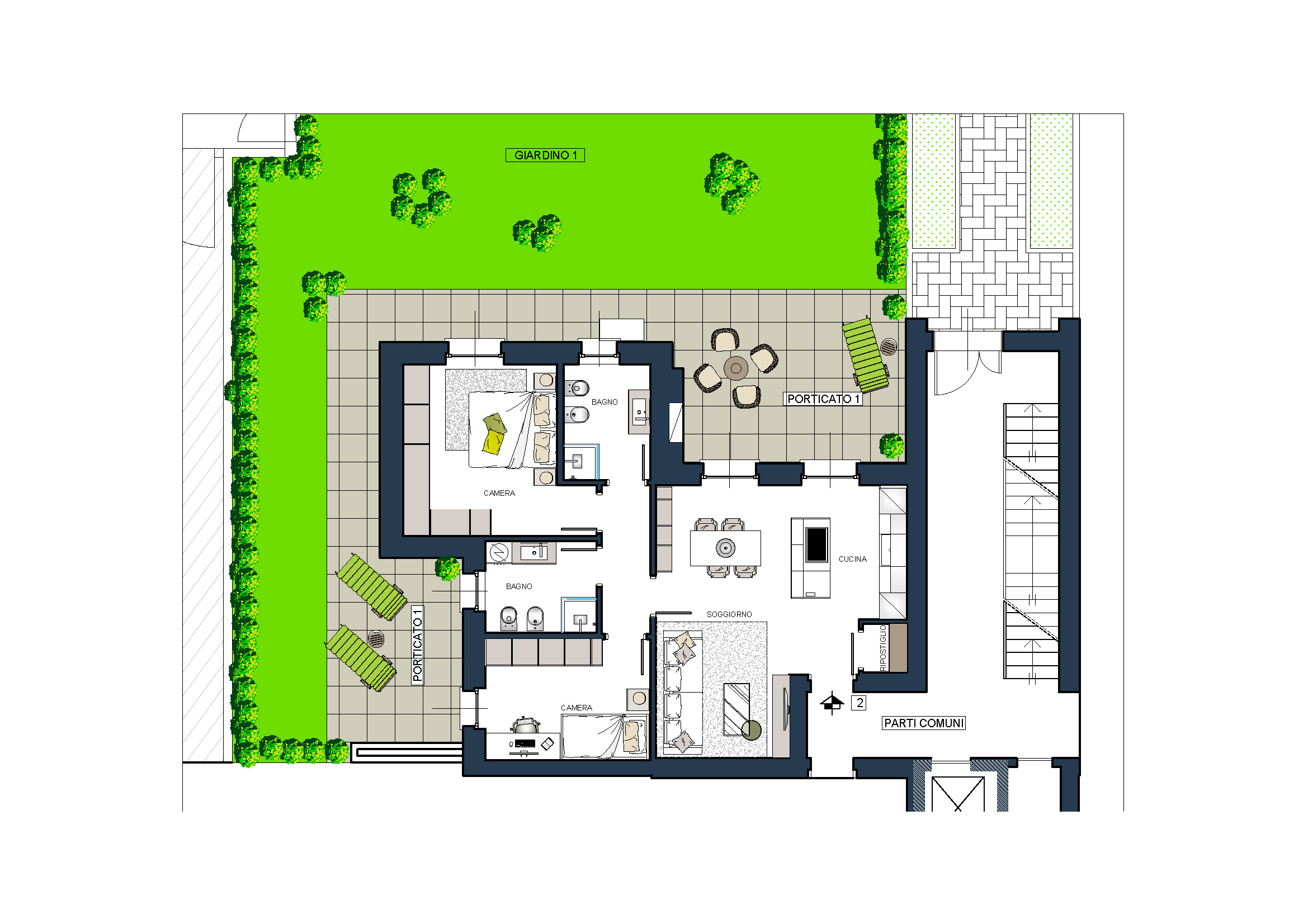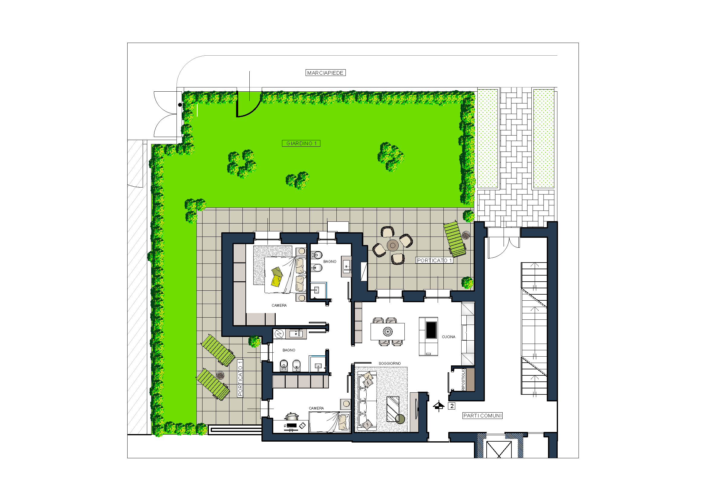 + giardino privato di mq 130 con accesso da cucina, soggiorno e camere